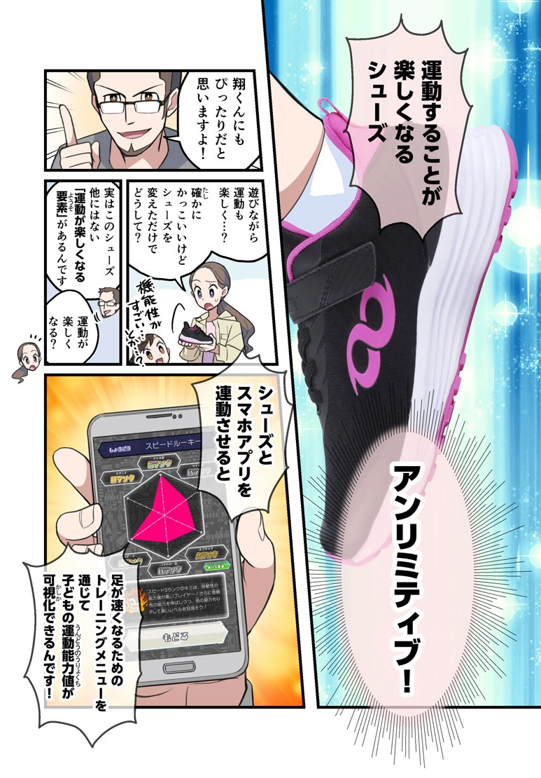 スマホアプリとの連動で、運動能力を可視化できる新感覚シューズ。自分の運動能力を高めたり、アルティメットモードで友だちと競争したり。アンリミティブを履けば外で思いっきり遊びたくなる!シューズの魅力を伝える店頭配布用パンフレット。