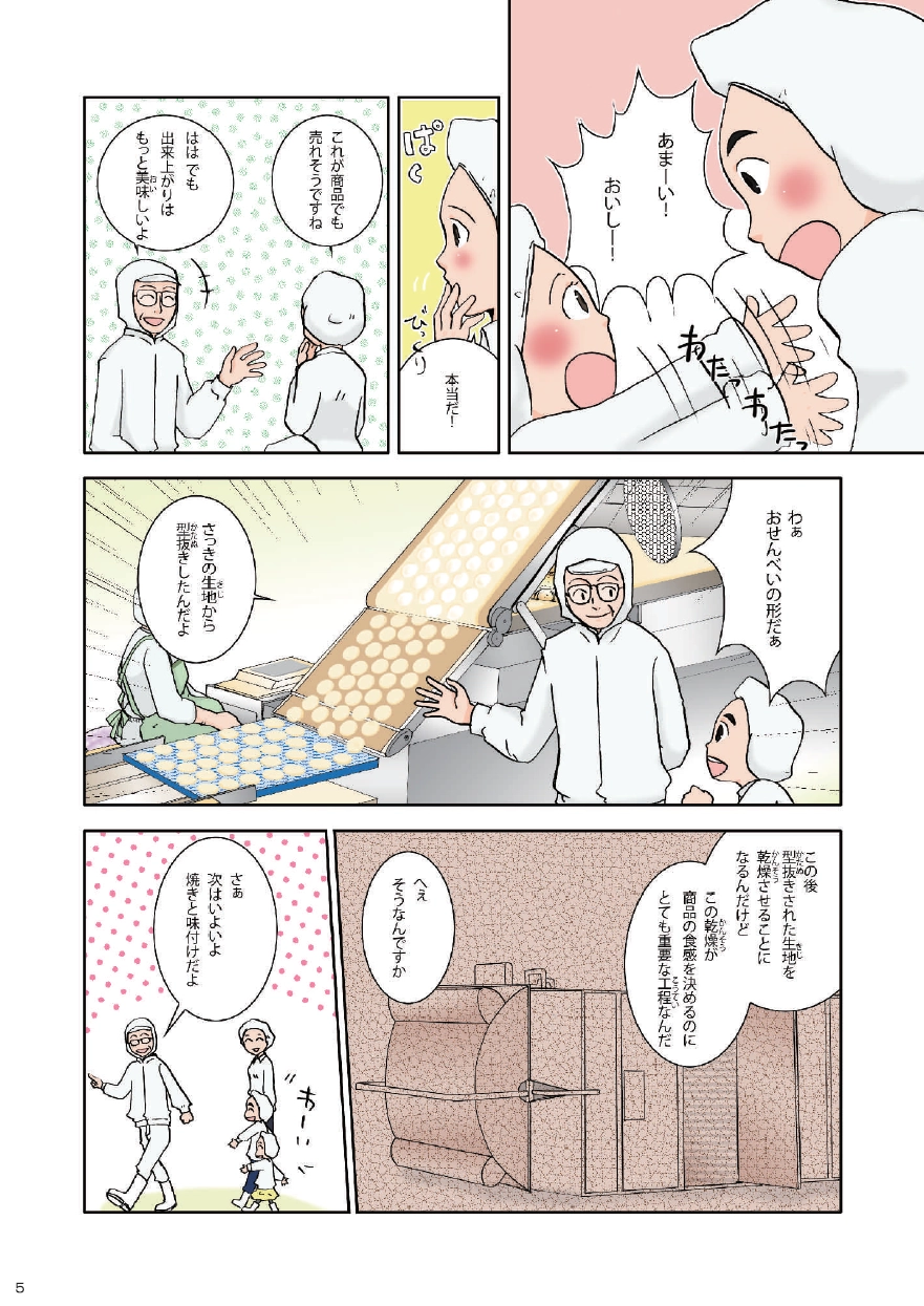 あられとおせんべいってどうやって作るの? あられとおせんべいの違いって何? あられ・おせんべいをもっと楽しく、もっと美味しく食べていただけるように、その製造工程などを漫画で紹介。イベントや店頭で配布するパンフレットです。