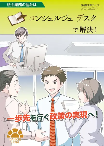 自治体法務サービス「コンシェルジュデスク」のメリットを漫画で紹介。法制業務に頭を抱える職員に、魅力満載の一冊です。