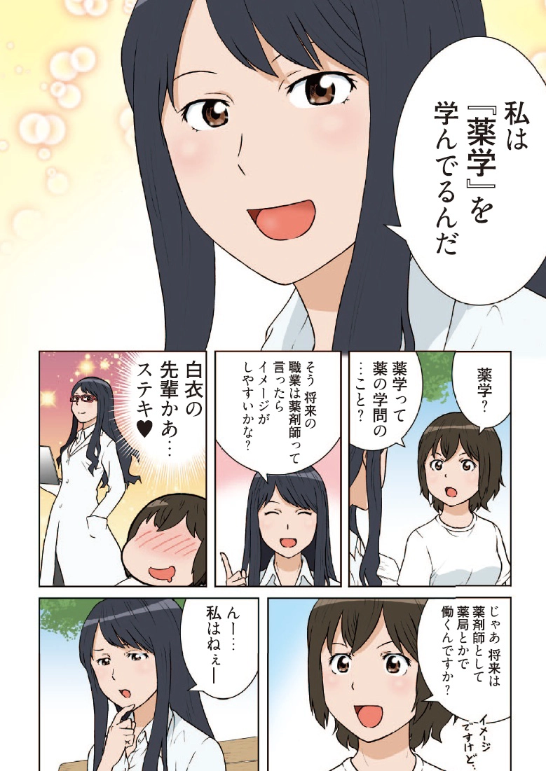 バレー部の先輩に教えてもらったことで「薬学」そして「薬剤師」に興味を持ち始める主人公の尚美。薬学を学べる大学、社会での薬剤師の役割とその可能性についての理解が深まる一冊です。