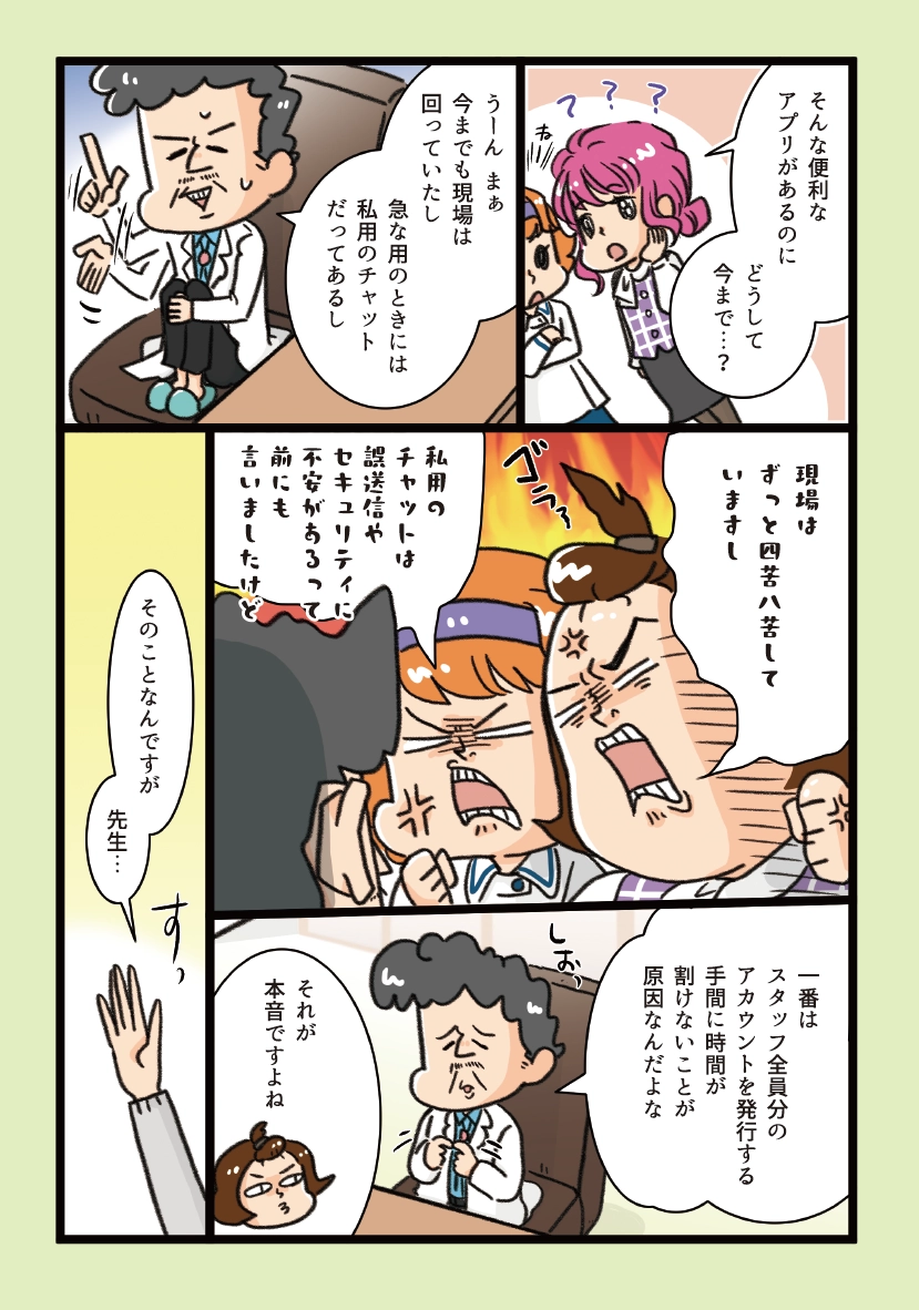 付箋の山、言った言わないのいざこざ、エンドレスな伝言ゲーム、チャットの誤送信に戦々恐々とするクリニックの現場スタッフたち。積もる不満でついには離職希望者まで出てしまい…。解決の鍵は「あるアプリ」の存在にあり!?