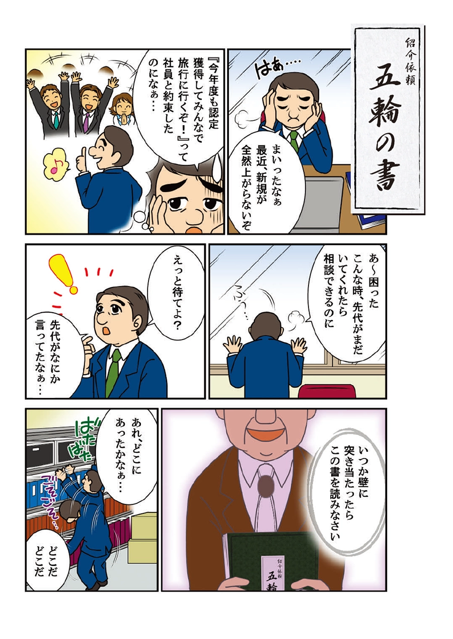 営業成績を伸ばしたいが、なかなか具体的なアイデアが浮かばない。 そんな悩みをもつ保険会社の社長が、ある日、先代の残してくれた秘伝の書「紹介依頼 五輪の書」のページを開く…。漫画で学べる営業スキルのノウハウ本です。