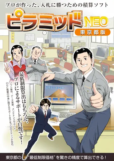 入札に勝つための積算ソフト「ピラミッドNEO 東京都版」の商品とサービス案内パンフレット。