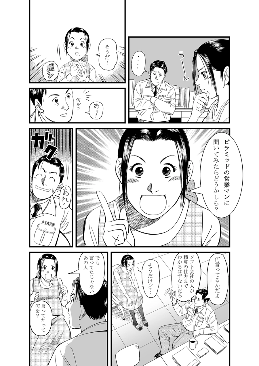 積算ソフト「ピラミッドNEO」を導入後、入札案件を順調に落札していた柏木建設。そんなある日、これまでにはない項目の入札に頭を悩ますことに…入札に勝つための積算ソフト「ピラミッドNEO 東京都版」の商品紹介パンフレット。