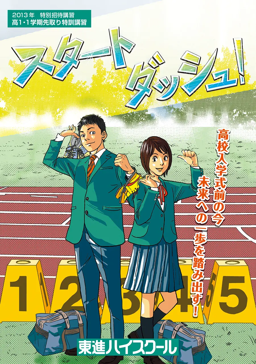 東進ハイスクール2011年 高1・1学期先取り特訓講習 DM用マンガリーフレット。勢いのあるストーリーで「東進」のメリットを紹介する生徒募集マンガです。