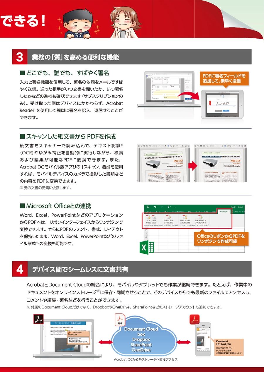- ビジネスで利用シーンが多いPDF。安心してPDFを使うためには、最新のセキュリティを備えたAdobe Acrobat DCがおすすめ!大塚商会なら、お得なプランで導入できます!Acrobat DCの機能・価格プランが記載された販促用チラシです。