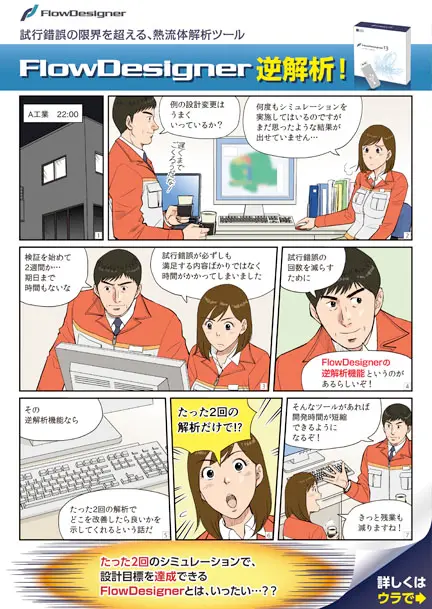 たった2回のシミュレーションで設計目標を達成できるという解析ソフトのFlowDesigner。漫画のセールスチラシです。