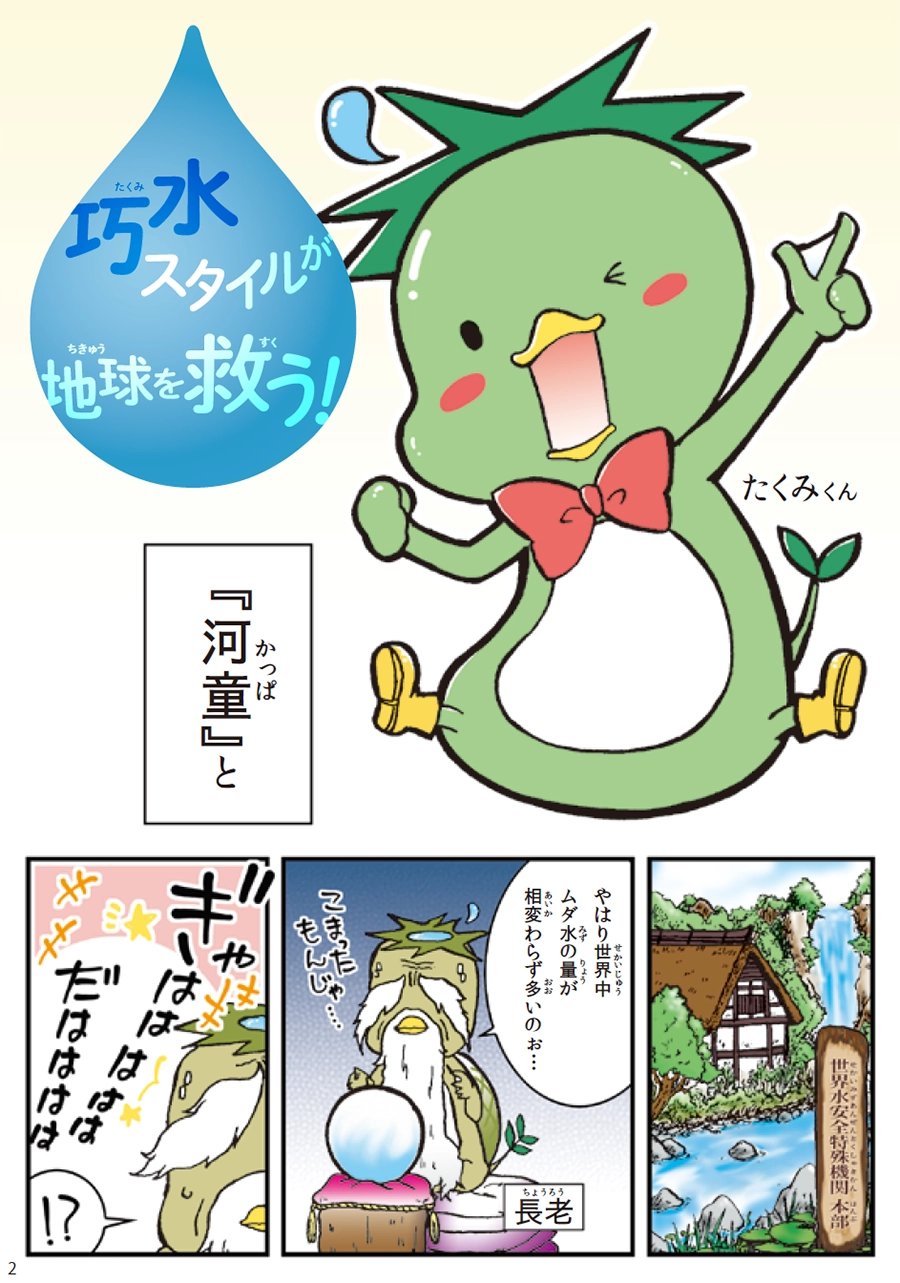 水の安全を守る組織に所属する河童のたくみくん。ある日、組織の長老河童から重要なミッションが与えられ、とある小学校へ派遣されることに。子どもたちに水の大切さ、そして水をかしこく使う方法を知ってもらうための1冊です。