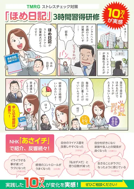 社員のストレスケアに悩む企業様向けに、気軽に対策できる「ほめ日記」研修を紹介。イベントで配布するチラシを、マンガを効果的に使いながらデザインしました。